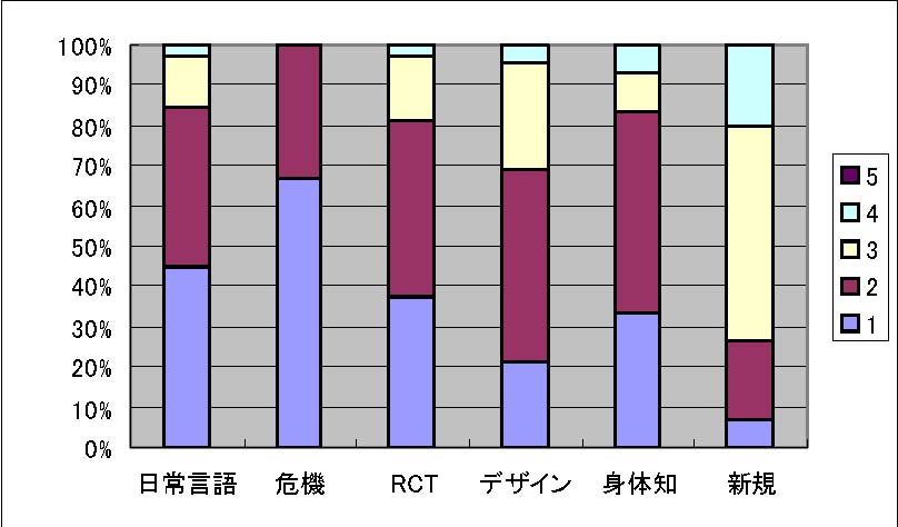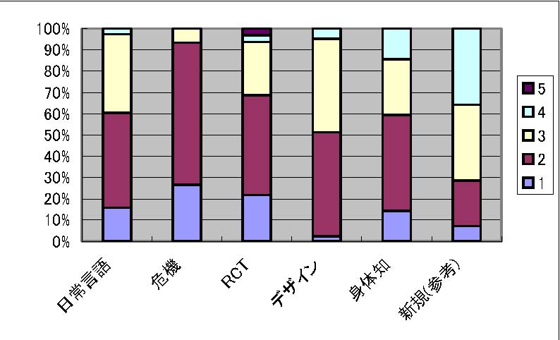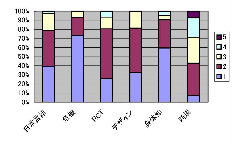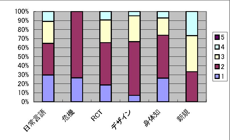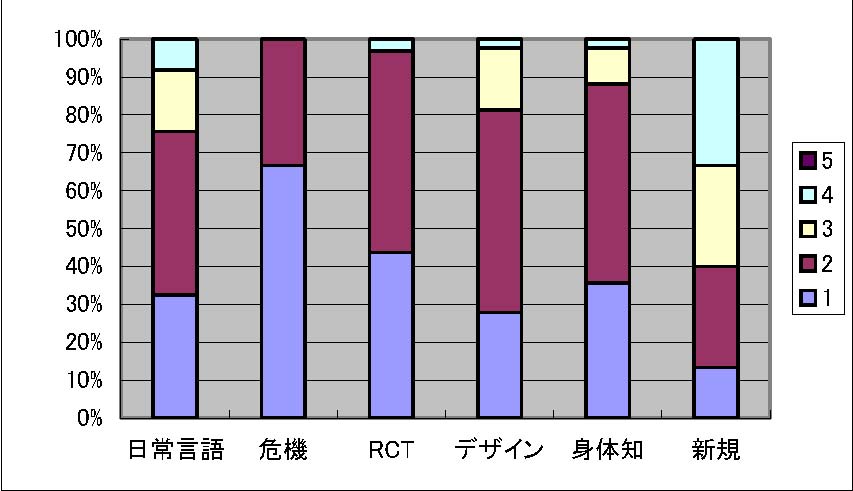 図3: 社会貢献のインパクト 社会貢献の見込み 社会貢献の見込みに関するアンケート結果を図4に示します。アンケートは5段階評価で、1が「十分期待できる」で、5が「全く期待できない」をあらわしています。本項目に関しては、「危機」「RCT」「デザイン」「身体知」ほぼ等しく上位4件を占め、続いて「日常言語」、「論文作成」の順に有意に差がひらいてゆく (と判断されている)ことが確認されました。