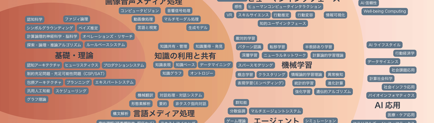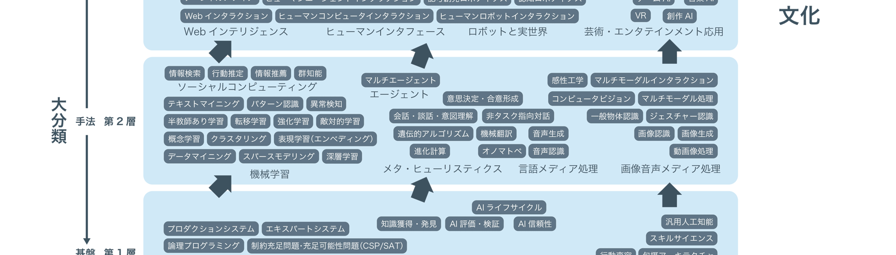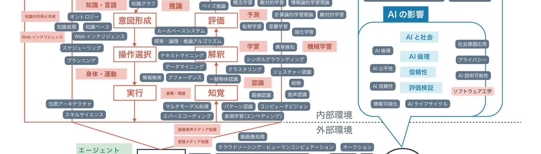 AI技術マップは、2019年に発刊した「AIマップβ」の改訂版である。人工知能学会 論文誌編集委員会の協力により、キーワードを精査し、人工知能学会の論文キーワードとの共通化を図った。