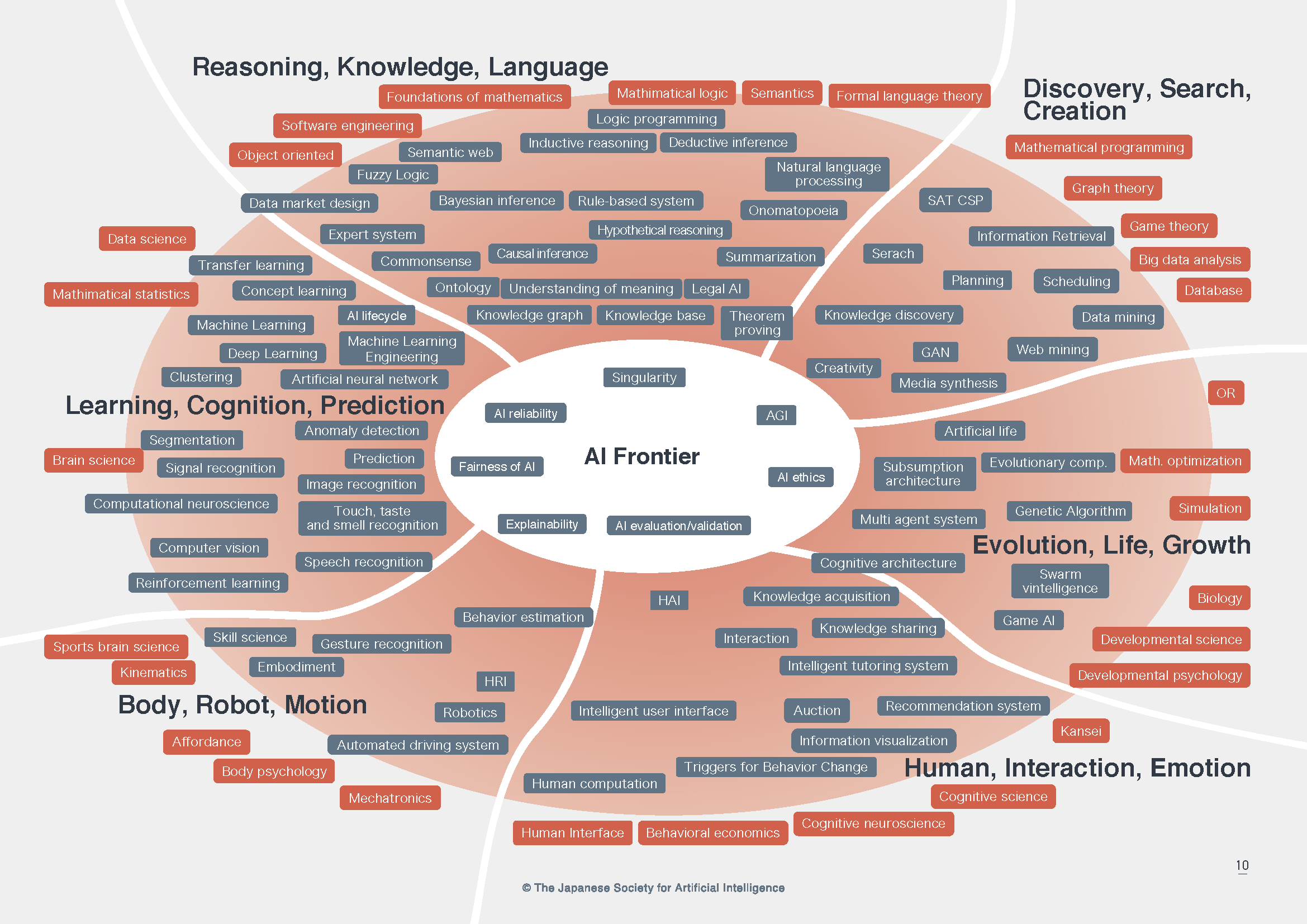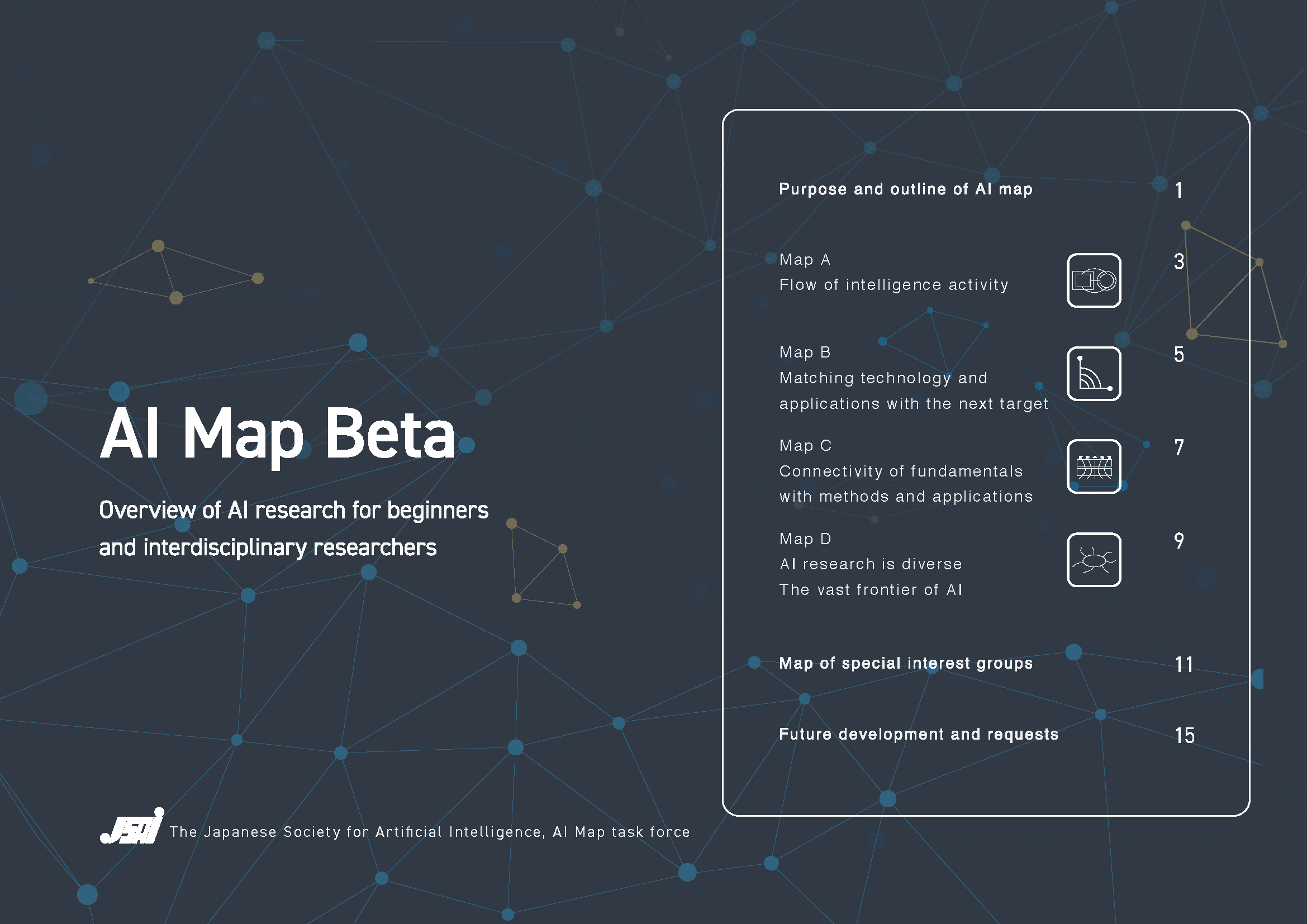AI研究には多数の研究分野があり、それらは複雑に関連しあって進展している。そのため全ての研究分野の関連性を矛盾なく、一枚の図版に収めるのは困難である。そこで、今回はAIマップのβ版として、異なる4つの観点からAI研究を捉えた4枚のマップを作成した。